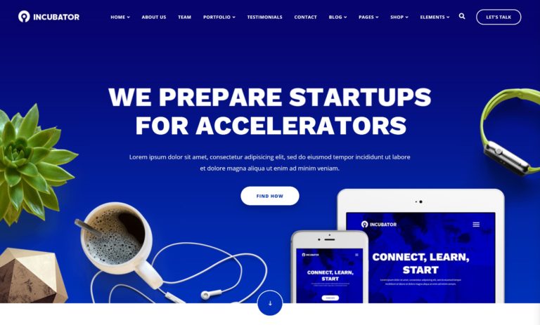 Importing the startup demo that comes with the Incubator theme is a quick way to get to work on your new website. However, if you browse the rest of the demos, you might see some others that are a good match for your requirements. Regardless of which of the Incubator demos you decide to use, your website will enjoy a well-designed and feature-rich homepage template. The startup demo homepage, for example, features a large header area that displays a suitable background image. You’re free to change the demo images, of course, but the ones that are included look really good and could be a great temporary solution while you get your site ready.