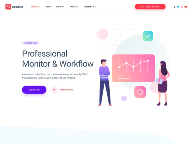 With demos that have been built for creating websites for startup software companies, agencies, and SaaS businesses, Sassico is a good example of an all-round, general-purpose startup WordPress theme. The design of the templates sticks to the tried-and-tested digital marketing style appearance, giving your startup website an immediately recognizable look. However, as you can edit these templates by using the supported Elementor page builder, you can easily add your own personality and branding to them.